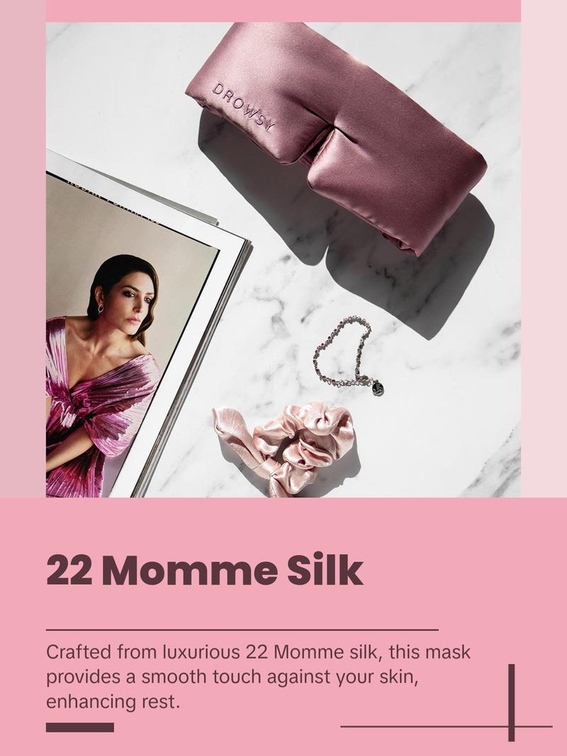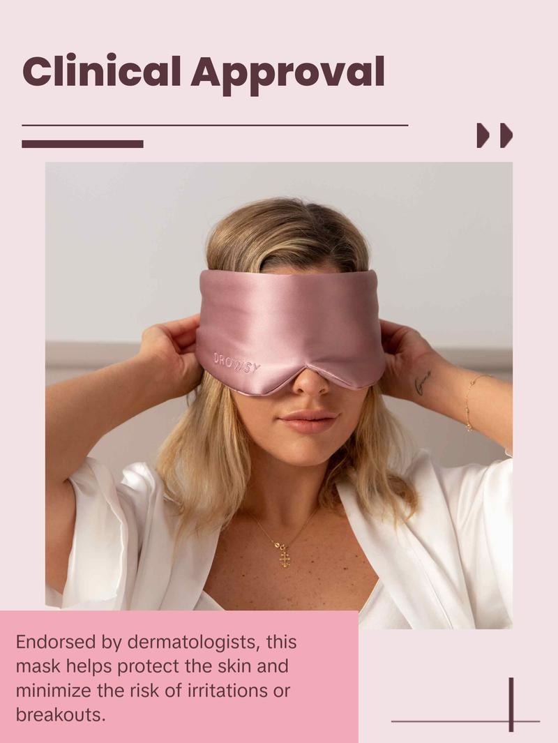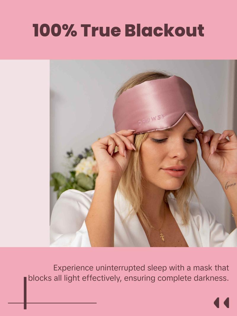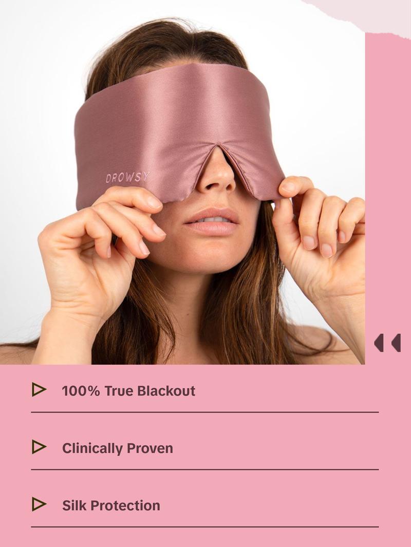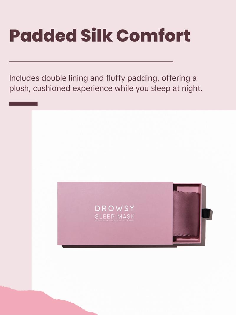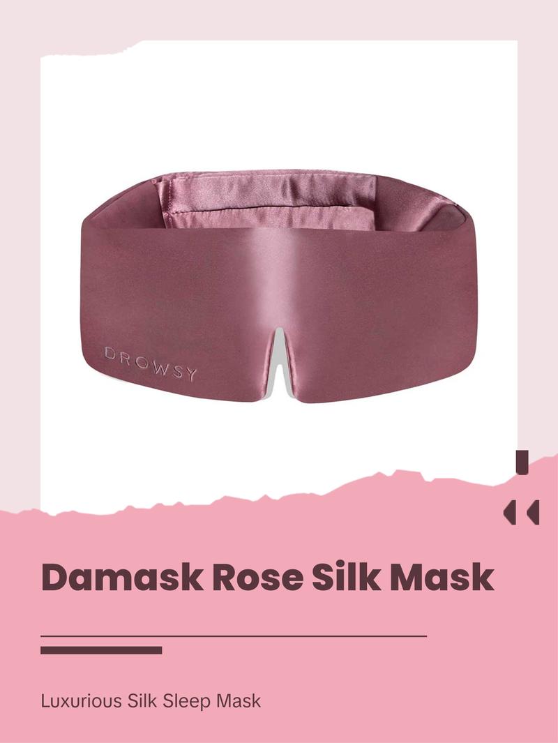 This Damask Rose silk eye mask is a revolution in rest. Clinically proven to unlock transformative skin results as you sleep. The fully adjustable, light-blocking design provides instant relief to weary eyes. Drowsy delivers uninterrupted, restorative beauty sleep every night. Wake up daily with smooth, glowing skin and renewed energy. 100% washable pink sleep mask.